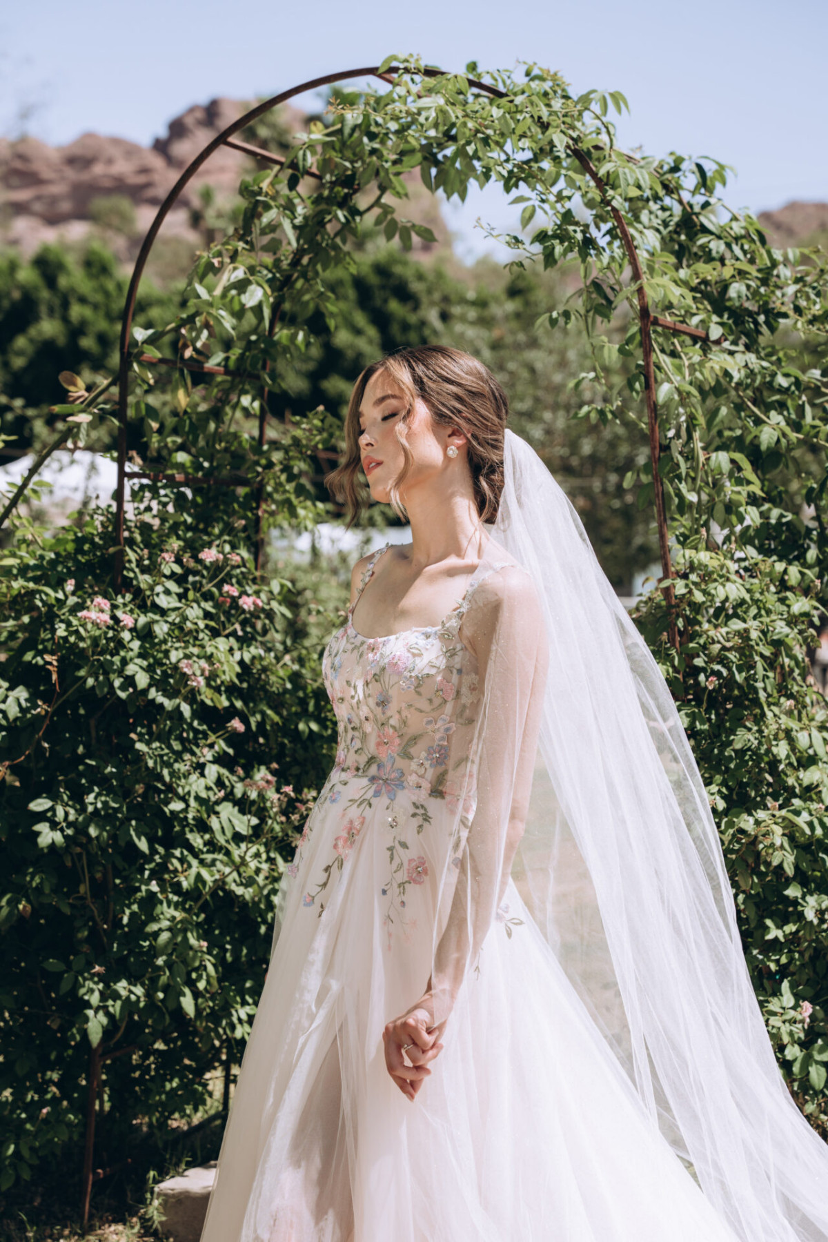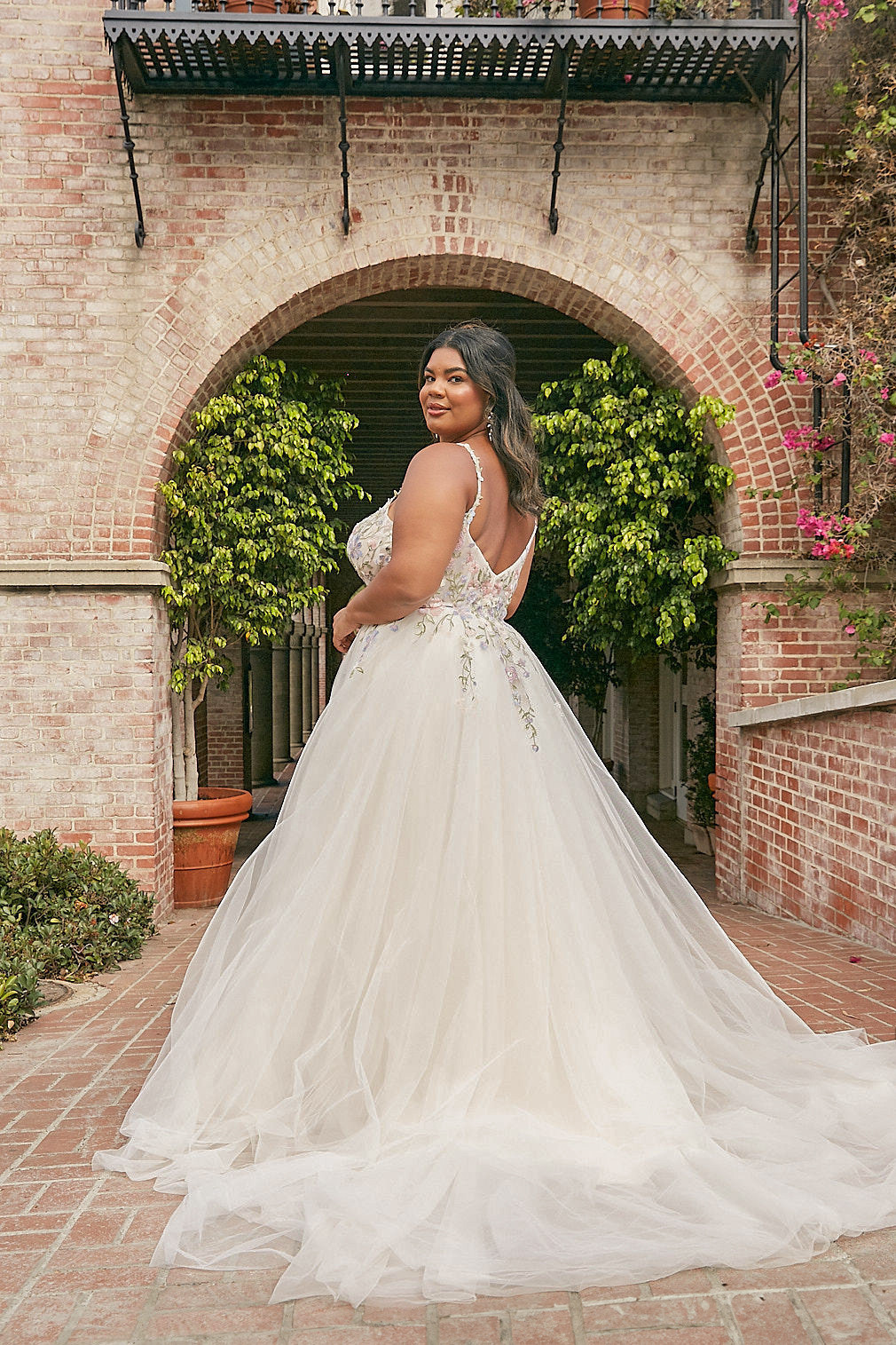 Style 8063 brings a fairytale to life for the modern romantic bride. This airy wedding gown features a gentle A-line silhouette crafted from delicate lace and tulle, adorned with beautifully colored embroidered lace for an ethereal effect. Soft floral lace straps frame a flattering scoop neckline, leading to a sheer lace bodice that feels like a storybook pressed with pastel blooms. From the waist, the skirt flows softly into layers of tulle, adding a weightless elegance, while a subtle leg slit introduces a hint of modern allure. For a truly unique and romantic gown, this enchanting design promises an unforgettable bridal moment.