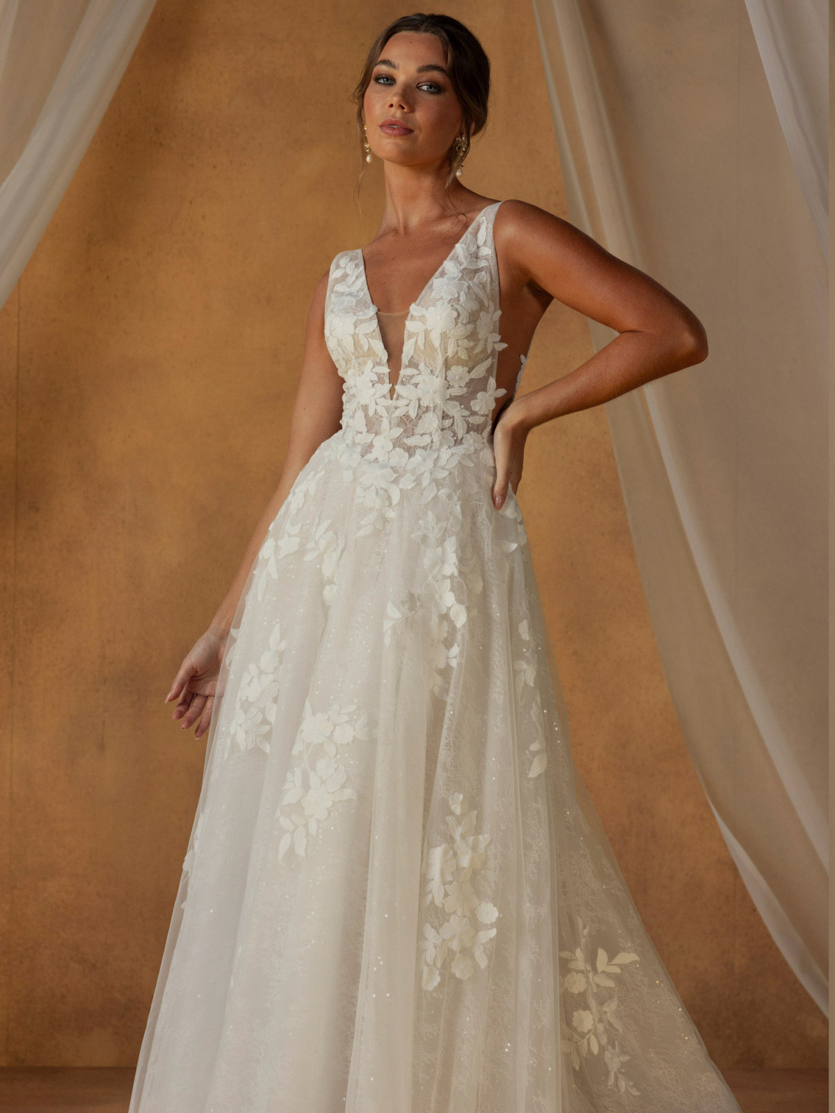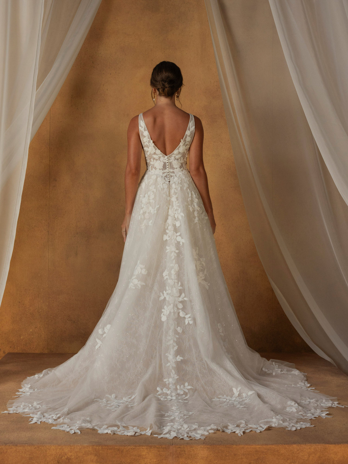 From the waist, an airy tulle skirt unfolds in soft gathers, creating light volume without ever feeling heavy. Thoughtfully placed motifs drift through the layers, echoing the detail of the bodice and creating a sense of harmony throughout the gown. At the back, a V-shaped illusion panel adds contemporary softness, sculpting the silhouette while maintaining the gown’s romantic spirit.