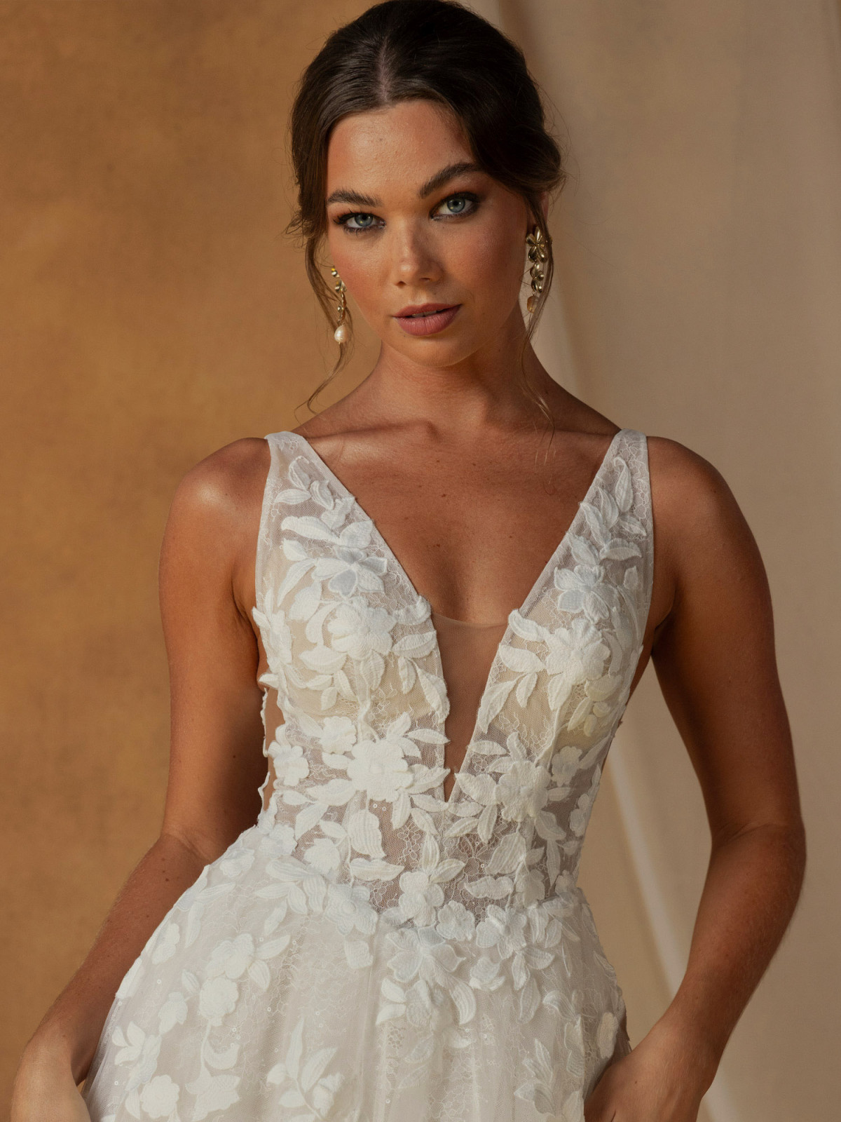 The bodice features a flattering V-neckline with supportive shoulder straps, layered in illusion lace and adorned with delicately embroidered 3D motifs that bring depth, texture, and soft dimension. A gently sculpted Basque waistline defines the figure, flowing seamlessly into the skirt while enhancing natural curves.