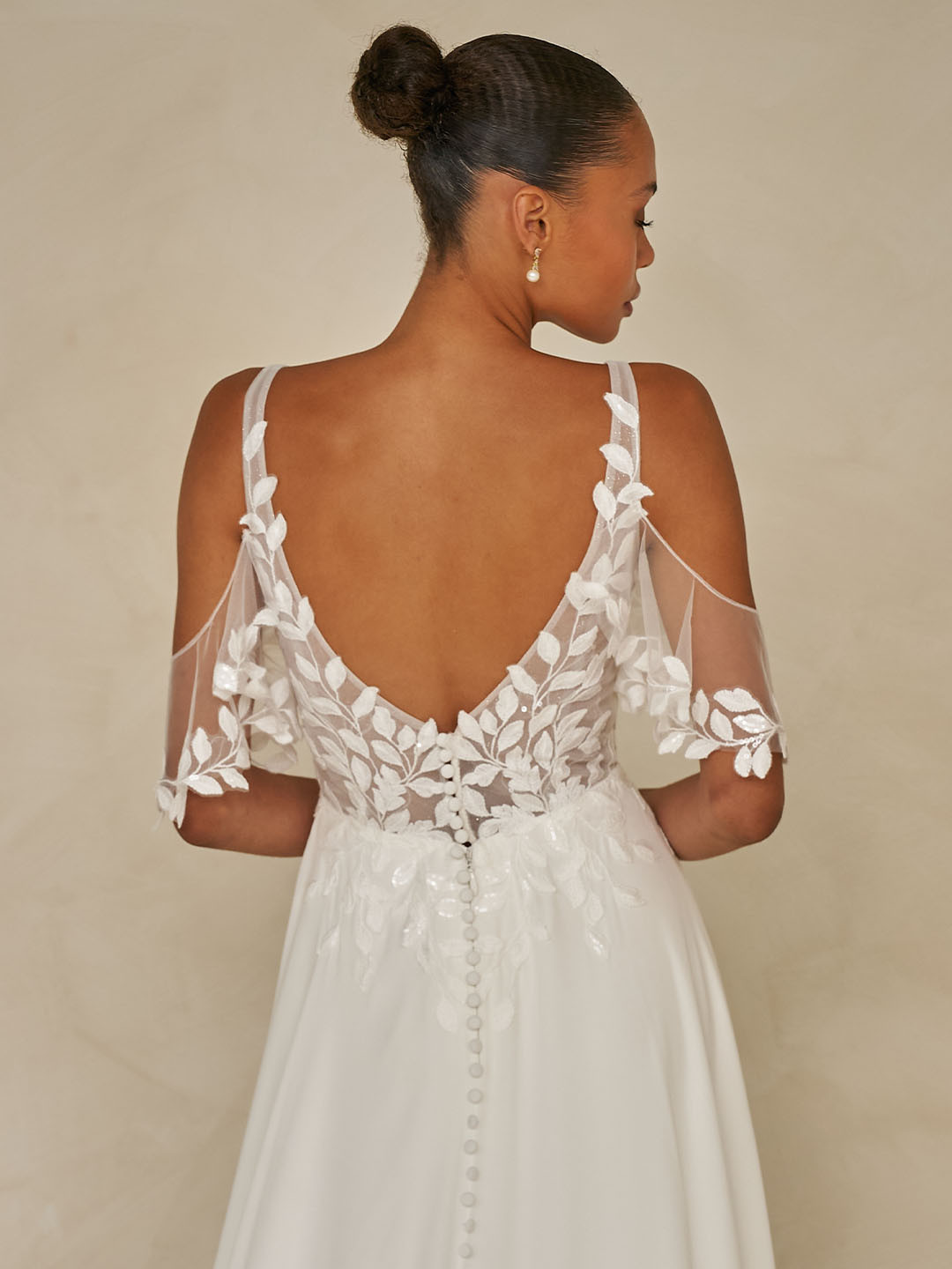 Crafted in whisper-light chiffon, the A-line circle-cut skirt skims the hips and moves with graceful fluidity, flattering every figure with ease and elegance. Light, dreamy, and deeply romantic, Wilmott is a gown that honours timeless love while embracing the spirit and individuality of today’s bride — inviting you to slip it on and feel its magic unfold.