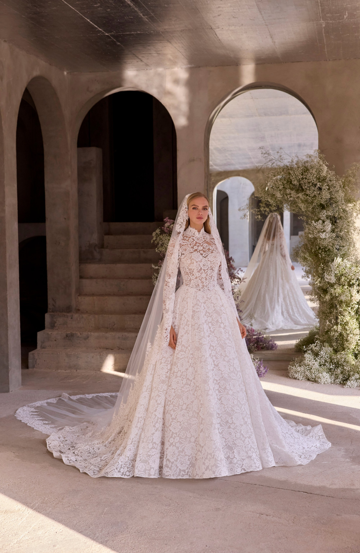 A romantic ball gown wedding dress featuring a high neckline and long sleeves, crafted in delicate peony lace. The structured boned bodice is designed with a flattering basque waist, flowing into a full skirt for a timeless, regal silhouette.