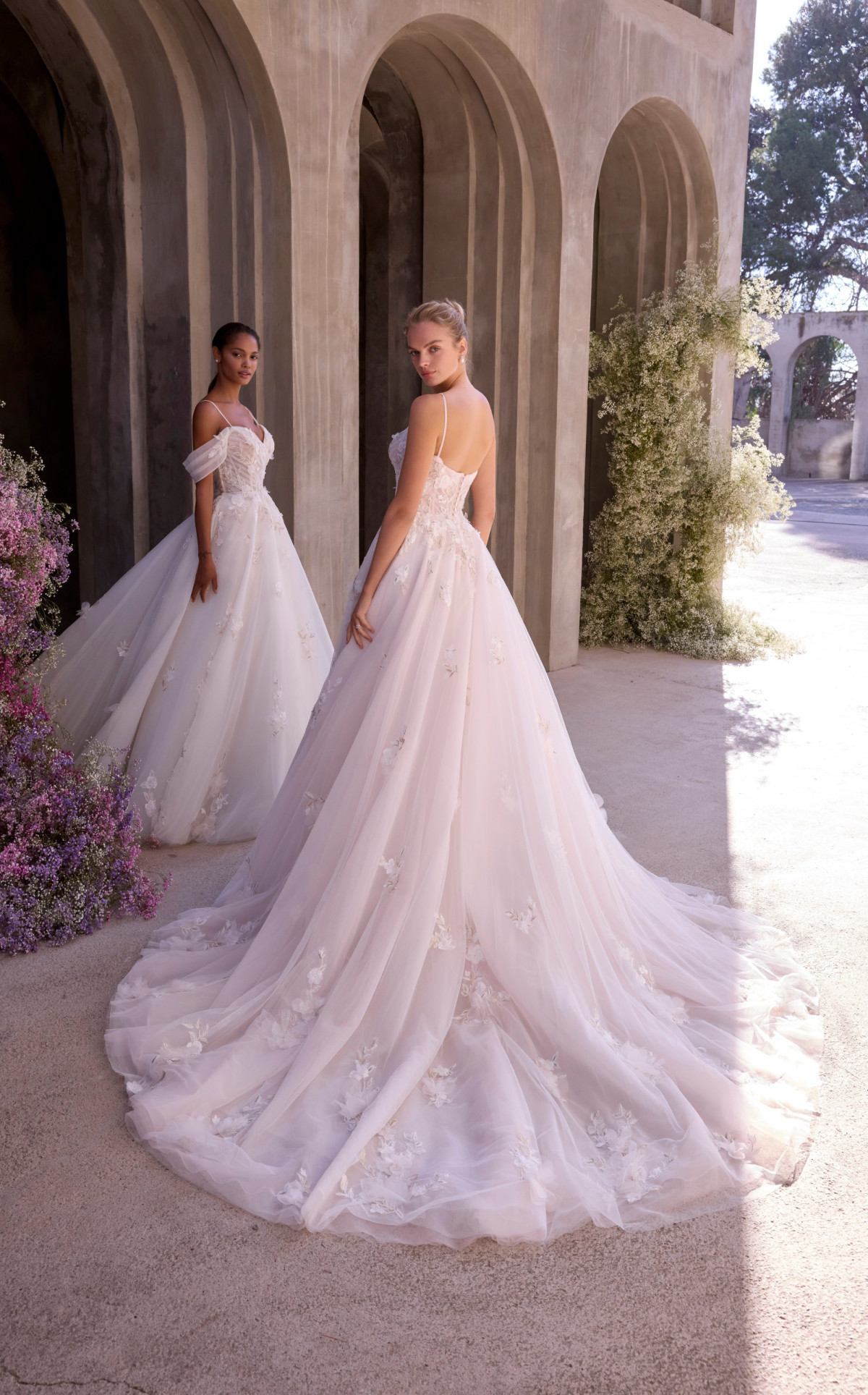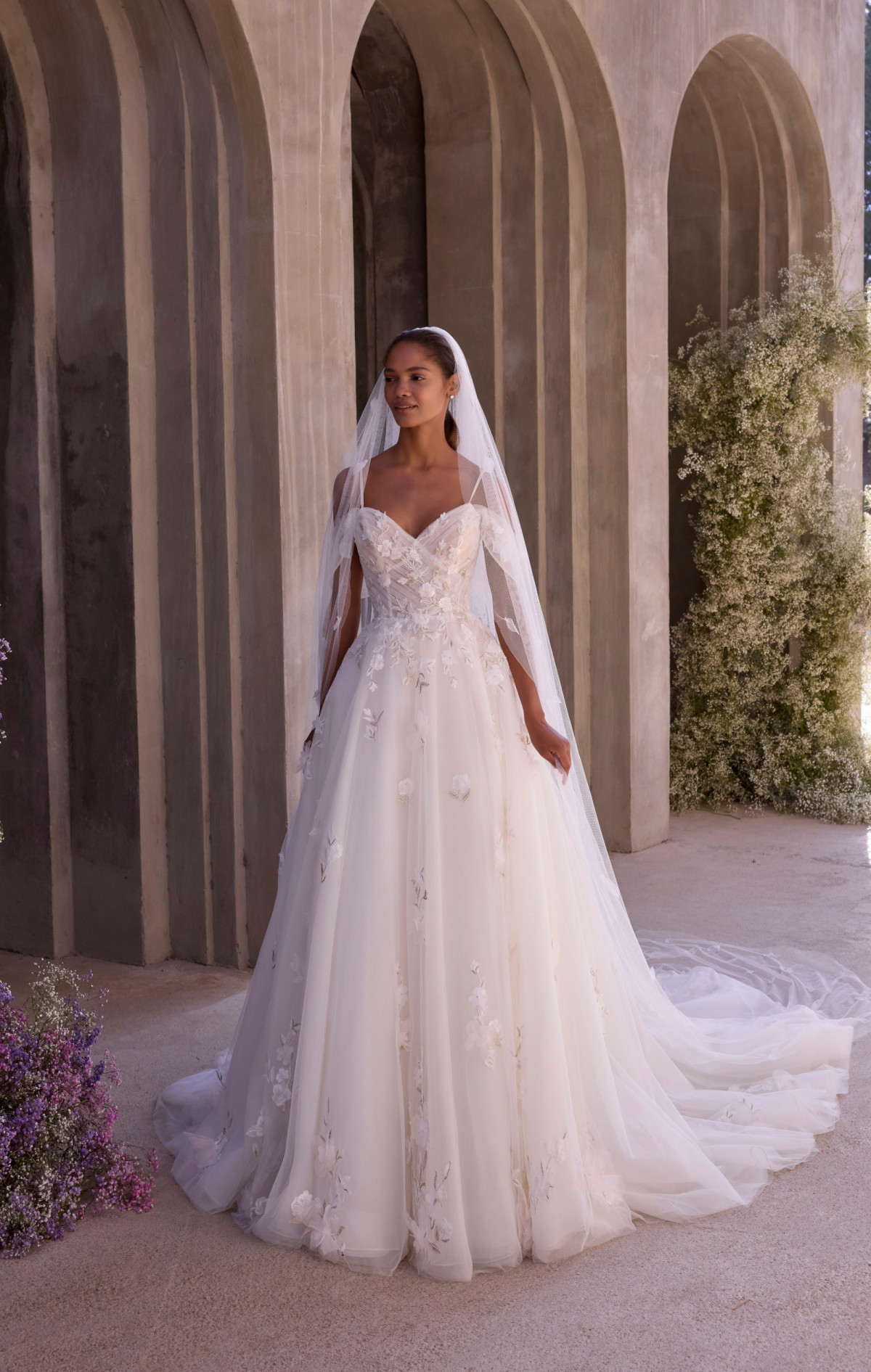 This ethereal A-line gown features a delicately draped sweetheart bodice, paired with detachable off-the-shoulder sleeves for a dreamy, romantic touch. Crafted in floral embroidered tulle, its intricate thread-work adds a whisper of elegance to every step.