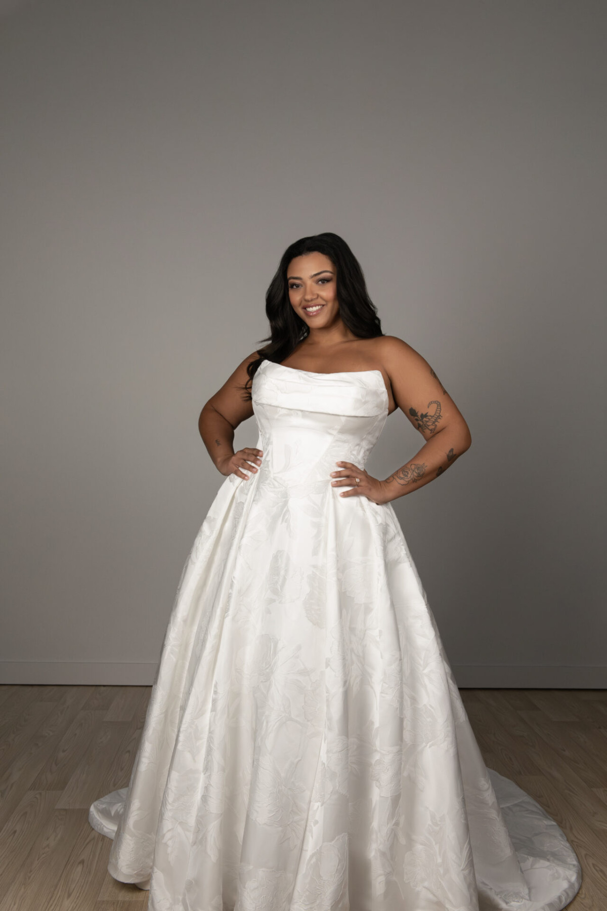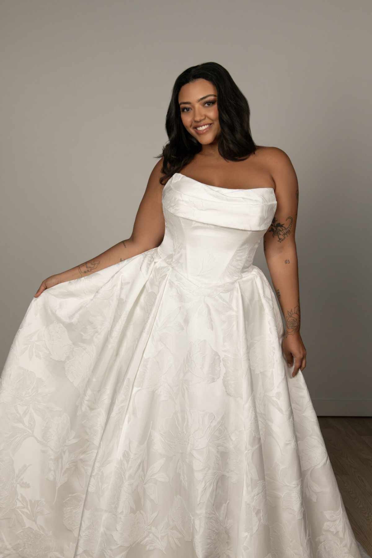 For the bride who effortlessly combines modern sophistication with timeless romance, Style SY8084 captures whimsical fairytale charm alongside contemporary design. This stunning strapless ballgown features a ruched neckline that gracefully wraps into a fitted Basque waist bodice. Contoured seams sculpt the figure before flowing into a pleated skirt, highlighted by a classic row of fabric-covered buttons extending the length of the gown. The pleated waist beautifully enhances the princess silhouette, which expands into a voluminous ballgown crafted from satin jacquard—creating a sleek, fashion-forward statement.
