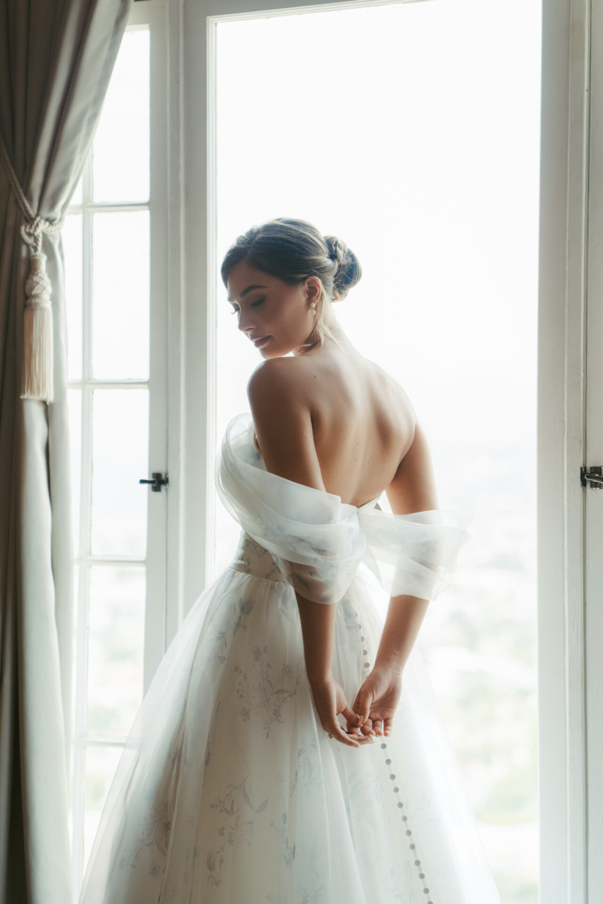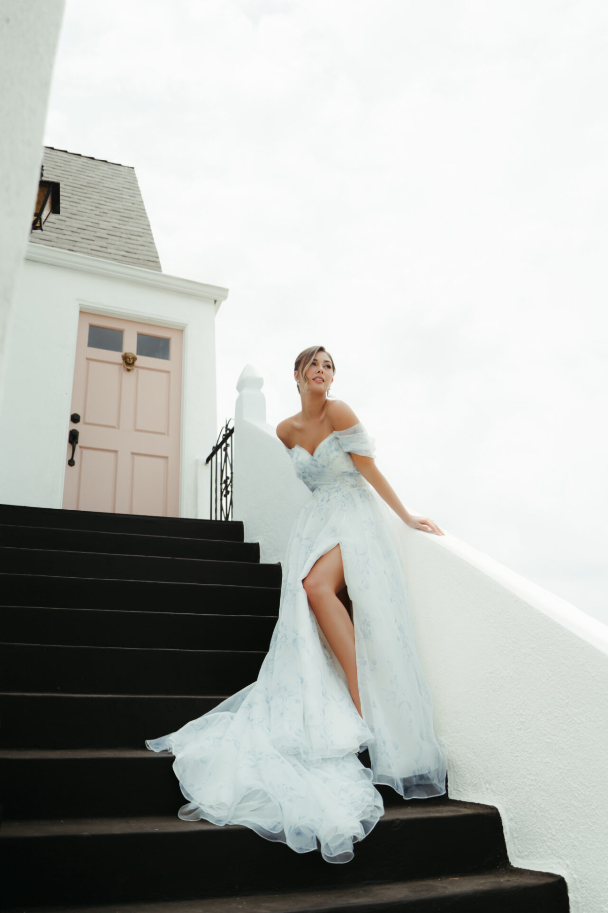 Style SY8215 by Essense of Australia in French Blue brings a fresh and vibrant twist to bridal romance. Crafted from printed organza adorned with delicate blue floral motifs, this A-line gown features a gracefully defined Basque waist that flatters the figure. Off-the-shoulder straps lead into a romantic sweetheart neckline, framing the bodice with timeless charm. Layers of lightweight chiffon cascade from the waist, flowing softly with every step, while a high leg slit adds a modern, effortless touch. Perfect for the bride seeking a unique blend of classic elegance and contemporary sophistication, this gown captures both romance and movement in one stunning design.