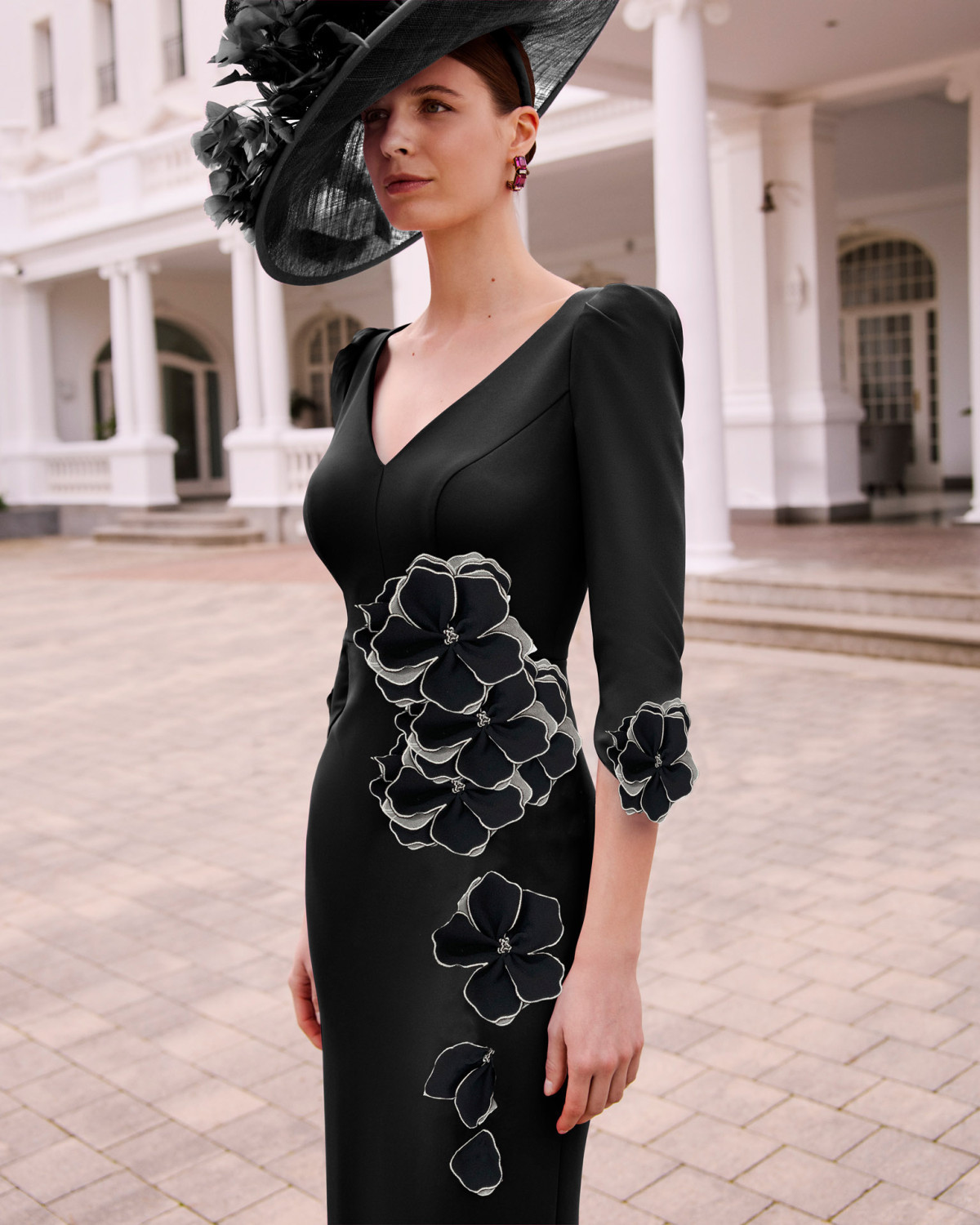 For the Mother of the Bride, Mother of the Groom, or a distinguished special guest, this long gown combines modern elegance with timeless romance. Delicate 3D floral appliqués create a striking, textured effect, while the flattering V-neckline beautifully frames the décolletage. Three-quarter sleeves offer graceful coverage, and the skirt flows with soft feather details and scattered embellishments that catch the light with every step. A sophisticated and memorable choice for any cherished occasion.