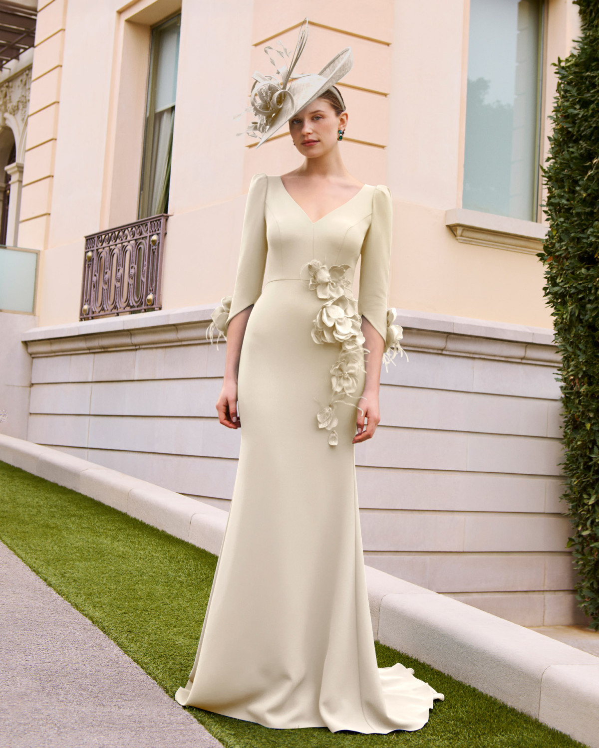 For the Mother of the Bride, Mother of the Groom, or a distinguished special guest, this long gown combines modern elegance with timeless romance. Delicate 3D floral appliqués create a striking, textured effect, while the flattering V-neckline beautifully frames the décolletage. Three-quarter sleeves offer graceful coverage, and the skirt flows with soft feather details and scattered embellishments that catch the light with every step. A sophisticated and memorable choice for any cherished occasion.