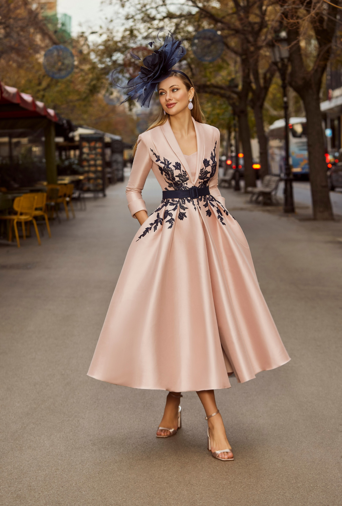 Contemporary yet beautifully refined, this A-line Mikado dress offers a striking blend of structure and elegance. Floral lace appliqués add delicate detail, while the cinched, belted waistband gently defines the silhouette. The three-quarter sleeves and flattering V-neckline create a balanced, graceful finish. An elegant piece of occasionwear for the mother of the bride or mother of the groom, this design invites you to try it on and experience its polished shape and timeless appeal.