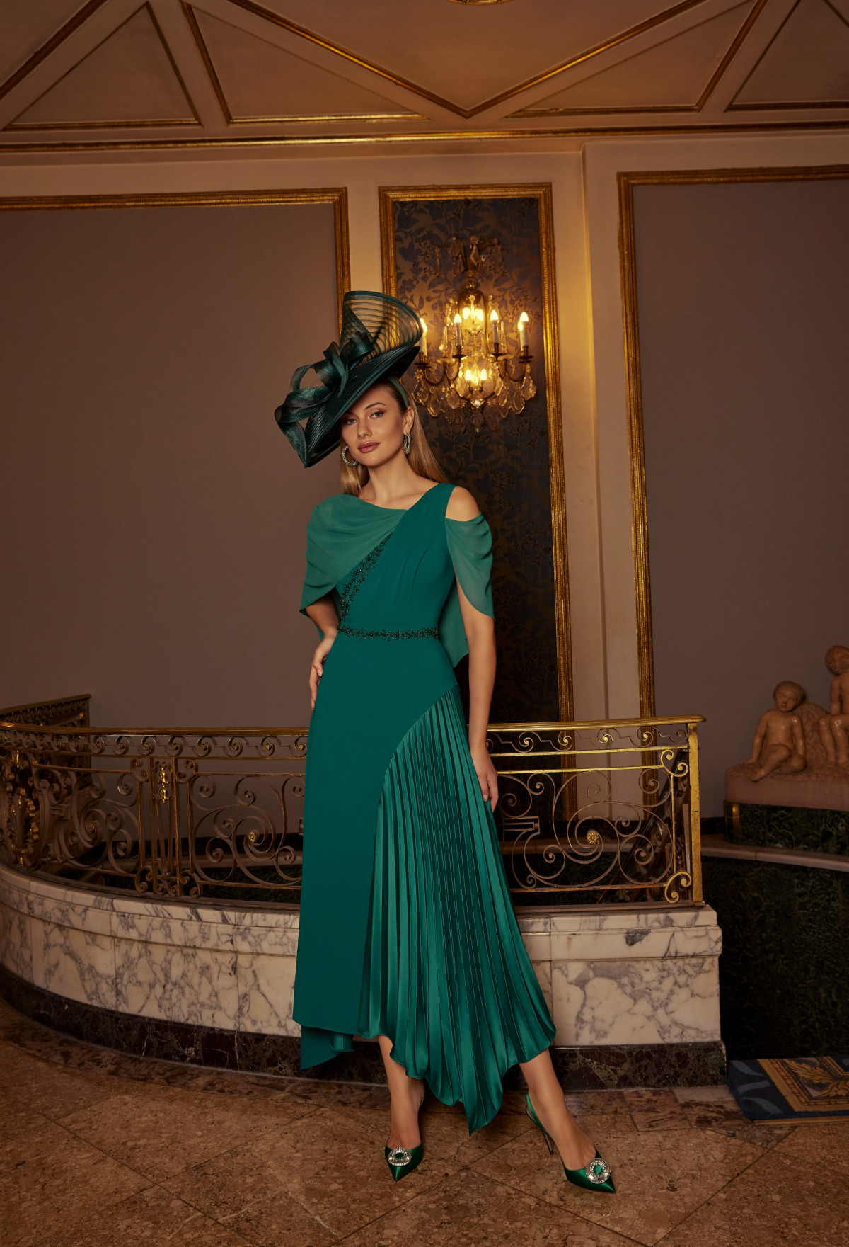 Contemporary and effortlessly elegant, this A-line dress makes a refined statement with its striking design details. The contrasting pleated-to-straight skirt creates beautiful movement and modern interest, while the elegant drop cape sleeves drape softly for a graceful finish. A delicately beaded waistband defines the silhouette with subtle sparkle. A sophisticated piece of occasionwear for the mother of the bride or mother of the groom, this design invites you to try it on and experience its fluid elegance and confident style firsthand.